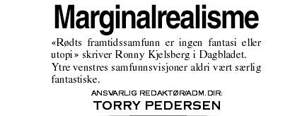 Men Rødts framtidssamfunn er ingen fantasi eller utopi. I det nye prinsipprogrammet som ble vedtatt på landsmøtet 9-12 mai, beskrives vår sosialisme som en prossess som bygger videre på tradisjonene fra vår egen historie med klassekamp og politisk kamp som blant annet førte til samvirketanken, kooperasjonene og kravene om en godt utbygd velferdsstat. Det er ingen fantasi - det er videreføringen og videreutviklingen av dagens samfunn.