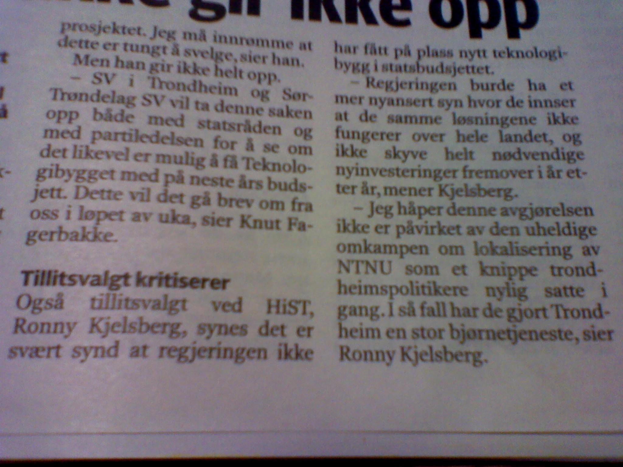 Adresseavisen har de siste par dagene slått stort opp at heller ikke på årets statsbudsjett fikk Høgskolen i Sør-Trøndelag nytt teknologibygg.