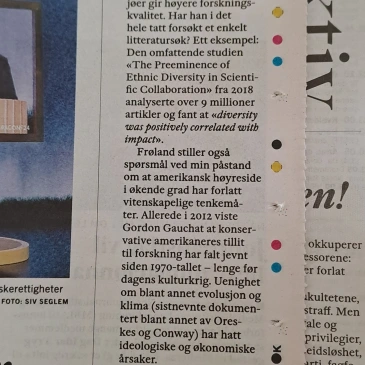 Da må jeg nesten spørre meg – har Frøland forsøkt å gjøre selv det mest rudimentære litteratursøk i vitenskapelige databaser, før han satte en slik påstand på trykk? Et leserinnlegg er ikke egnet for lange oppramsinger av litteraturlister, men la meg presentere bare en av de mest omfattende av studiene, den mye siterte “The preeminence of ethnic diversity in scientific collaboration”  fra Nature Communications i 2018. Her har forskerne analysert over 9 millioner forskningsartikler, og konkluderer med at selv om resultatene selvsagt varierer både mellom fagfelt og ulike former for diversitet at “Broadly, we found that diversity was positively correlated with impact”. Som tittelen sier hadde etnisk diversitet størst påvirkning. Lignende resultater kan Frøland finne også fra mange andre studier. For fremtidige påstander om hva det finnes vitenskapelig belegg for eller ikke, anbefaler jeg Frøland å f.eks. gjøre et enkelt søk i forskningsdatabaser som Scopus før han sender inn lett dokumenterbar feilinformasjon til Klassekampen.