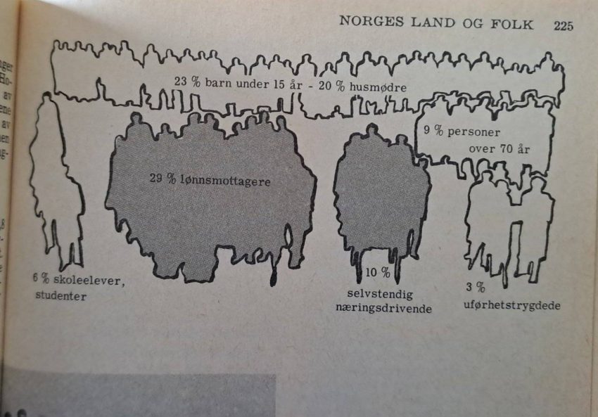 I Aftenpostens Hvem Hva Hvor for 1969 finner vi denne dystre statistikken over yrkesdeltakelse i befolkningen. Til sammen under 40% er i arbeid og “underholder de øvrige grupper”. Bekymringen er selvsagt stor og det advares mot lengre ferie og lavere pensjonsalder. Dette kan da ikke være bærekraftig?