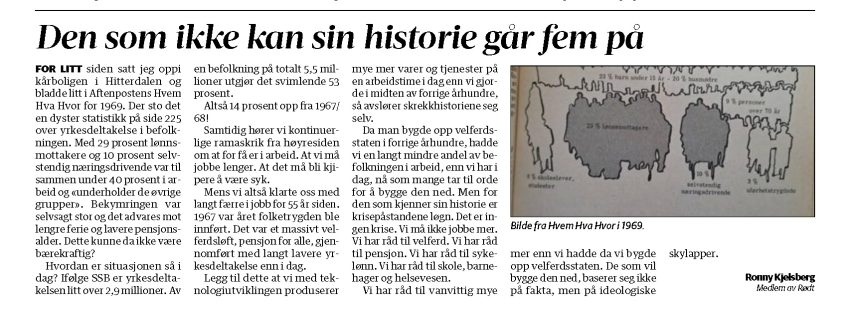 For litt siden satt jeg oppi kårboligen i Hitterdalen og bladde litt i Aftenpostens Hvem Hva Hvor for 1969. Der sto det en dyster statistikk på side 225 over yrkesdeltakelse i befolkningen. Med 29 prosent lønnsmottakere og 10 prosent selvstendig næringsdrivende var til sammen under 40 prosent i arbeid og «underholder de øvrige grupper». Bekymringen var selvsagt stor og det advares mot lengre ferie og lavere pensjonsalder. Dette kunne da ikke være bærekraftig?